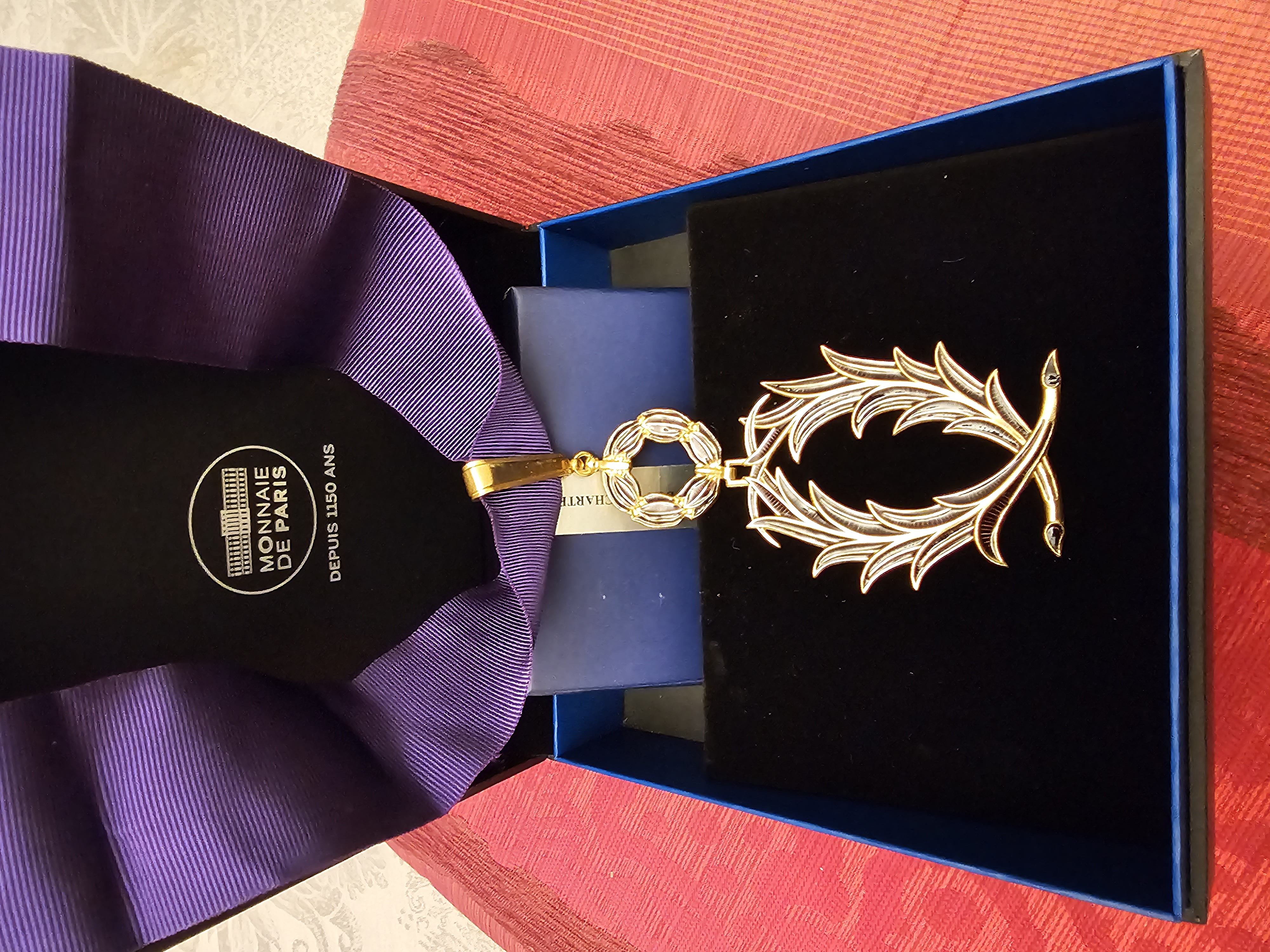Dr. Christian Amatore wearing the neck badge and ribbon of Commandeur de l'ordre des Palmes Académiques, France