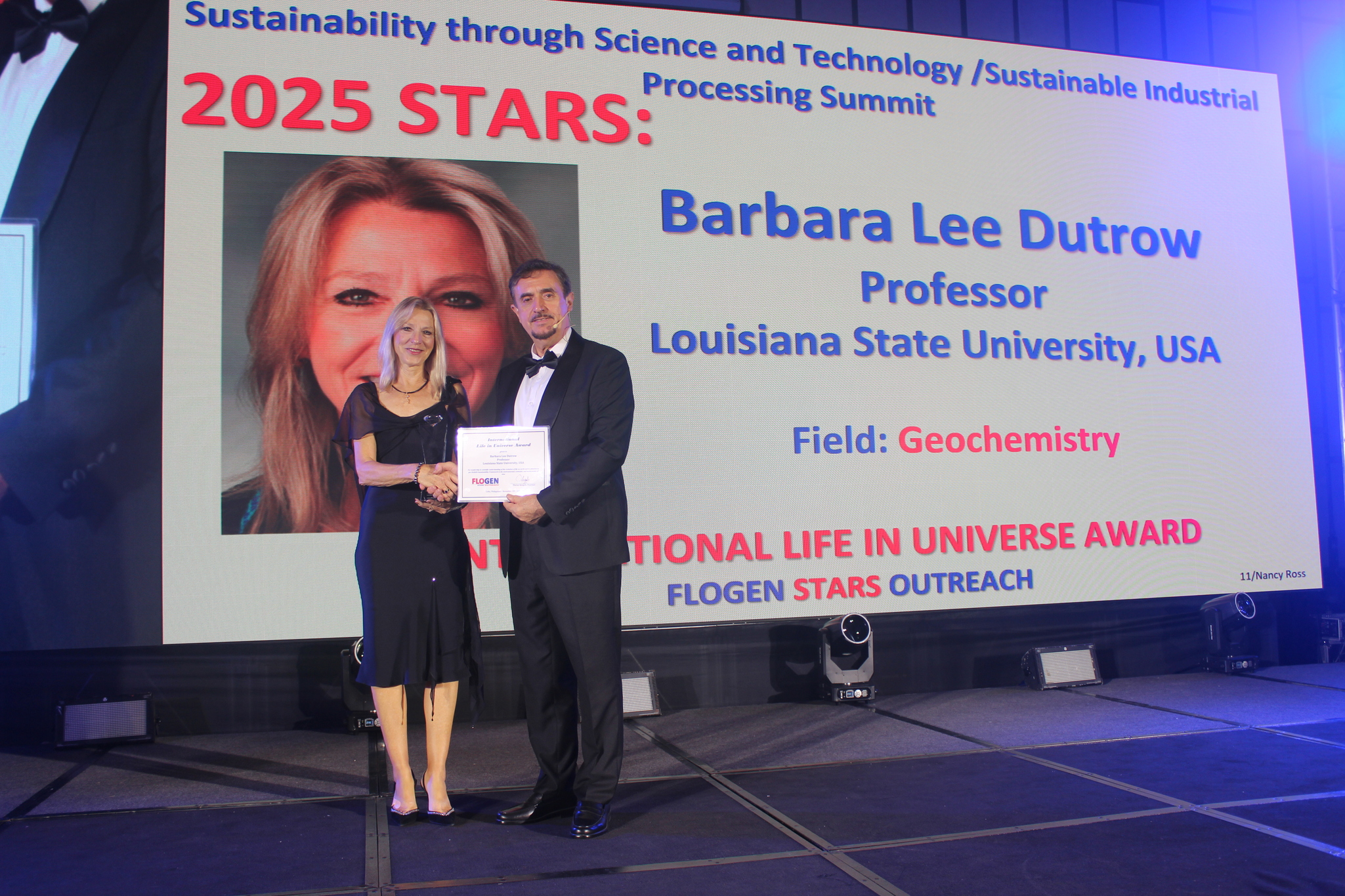 Dr. Barbara Dutrow receiving the International Life In Universe Award from Dr. Florian Kongoli at FLOGEN SIPS 2025