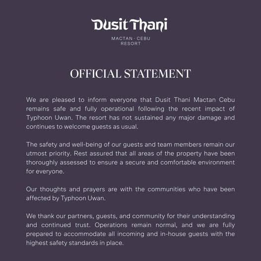 On November 10, 2025, Dusit Thani Mactan Cebu released an official statement following Typhoon Uwan, confirming that the resort remains safe and fully operational.