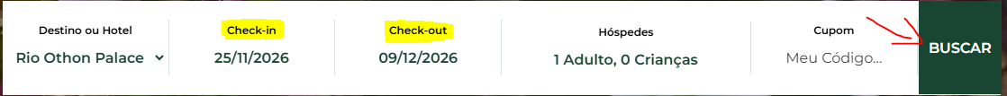 - Upon entering the website https://www.othon.com.br/, the page below will appear, and you will need to fill in the hotel information, dates of stay, and number of adults, then click search (buscar):