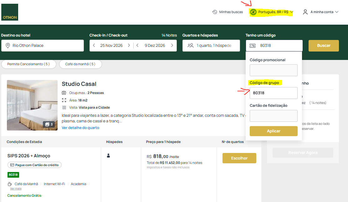 - After, the website will redirect you to the page with the available rooms. There, you need to enter the code 80318 in "Group Code" and click "Apply". Then click search; the discount will be applied automatically after the search.